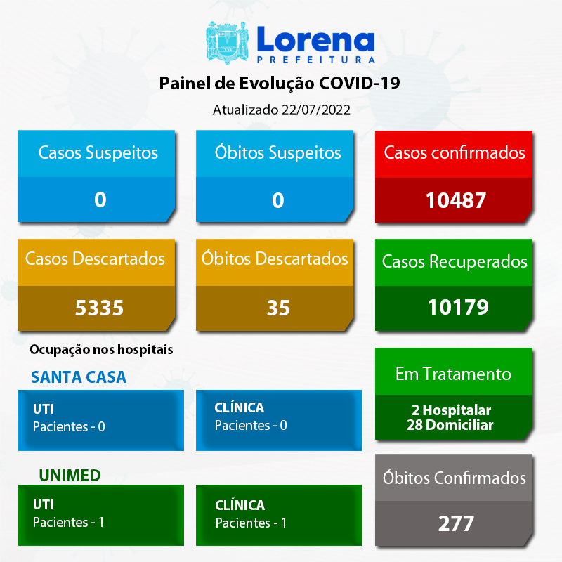 A contagem de pacientes em tratamento considera as internações na Santa Casa, Unimed e também de pessoas residentes em Lorena que estão internadas em hospitais de outros municípios. Logo, o total de casos em tratamento não é igual à soma das internações em hospitais municipais.