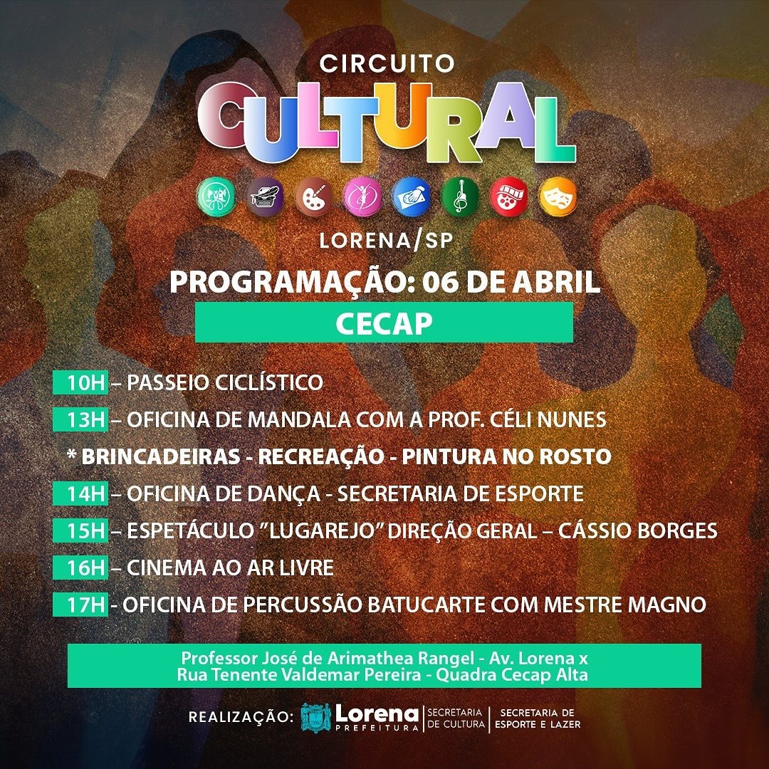 Dando continuidade à programação do Circuito Cultural em Lorena, a Prefeitura Municipal estará oferecendo neste sábado, 6 de abril, uma série de ações culturais, esportivas, sociais, de saúde e muito mais na quadra do bairro Cecap Alta. O circuito acontece das 10h às 17h, de forma totalmente gratuita.