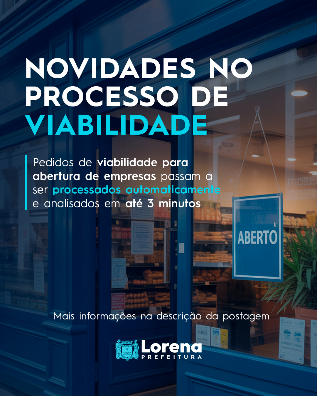 A Prefeitura de Lorena informa que, desde 26 de setembro, pedidos de viabilidade no sistema Via Rápida passaram a ser processados de forma automática. Dessa forma, a análise, que antes era feita pela Secretaria de Obras e Planejamento Urbano, será realizada pelo próprio sistema em até 3 minutos, já informando se o pedido foi deferido ou indeferido, e por qual motivo. Essa atualização torna o processo de abertura e regularização de empresas muito mais ágil.