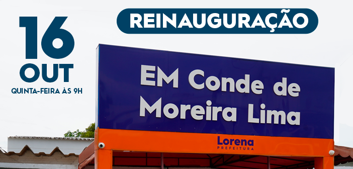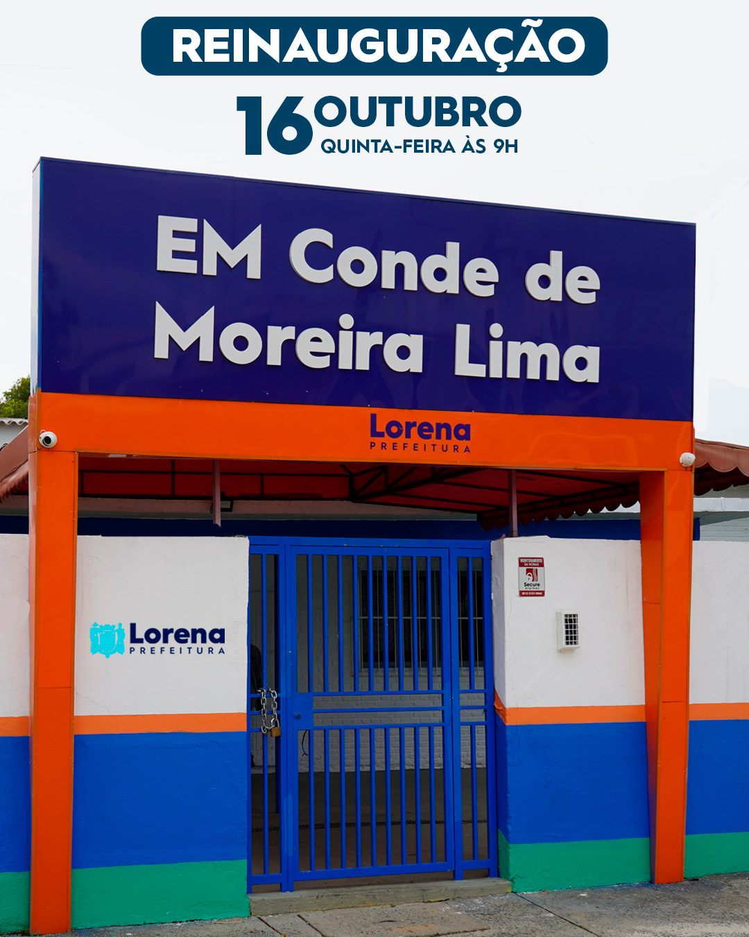 A Prefeitura de Lorena, por meio da Secretaria de Educação, tem a alegria de convidar toda a população para a reinauguração da Escola Municipal Conde de Moreira Lima (antigo prédio do Sesi), localizada na Rua Odila Rodrigues, nº 138, no Centro. A cerimônia será na quinta-feira, 16 de outubro, às 09h.