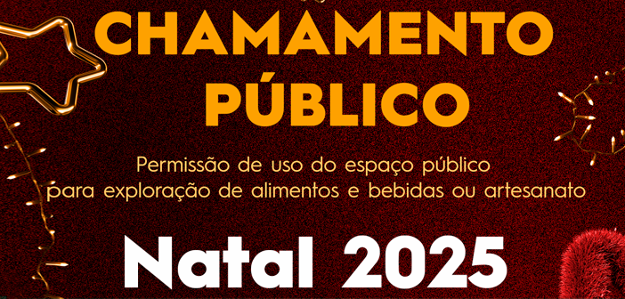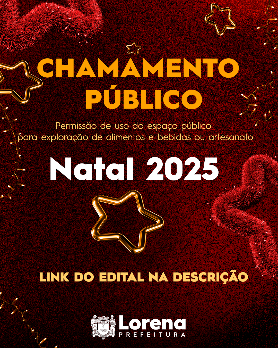 A Prefeitura de Lorena, por meio da Secretaria de Cultura, torna público o Chamamento Público nº 08/2025, para o recebimento de inscrições de pessoas físicas e jurídicas que tenham interesse na permissão de uso do espaço público para exploração de comidas e bebidas ou artesanato entre os dias 5 e 21 de dezembro, na programação do Natal Iluminado 2025, que acontece na Praça Dr. Arnolfo de Azevedo.