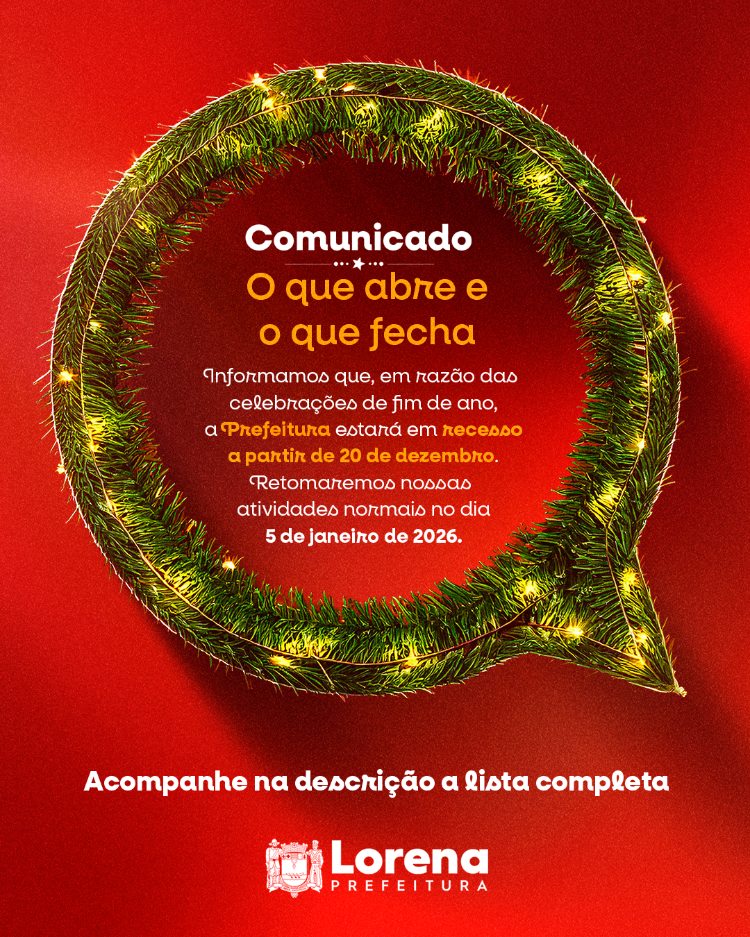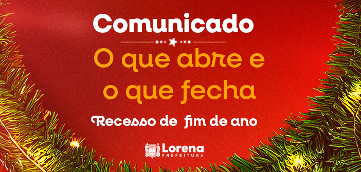 Devido ao Recesso de Final de Ano, entre os dias 20/12/2025 e 04/01/2026 não haverá expediente na Prefeitura de Lorena, conforme o Decreto Municipal nº 8.279/2025.